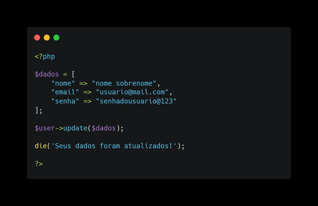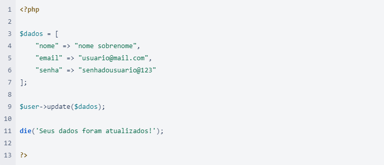 O código acima irá atualizar o nome, email e a senha do usuário. Vemos que no Código 1 não especificamos os dados que serão atualizados, apenas passamos os dados inseridos pelo usuário para a função update, então para um usuário atualizar sua senha e seu email, precisa enviar os seguintes parâmetros para a aplicação: senha=senha@123&[email protected].