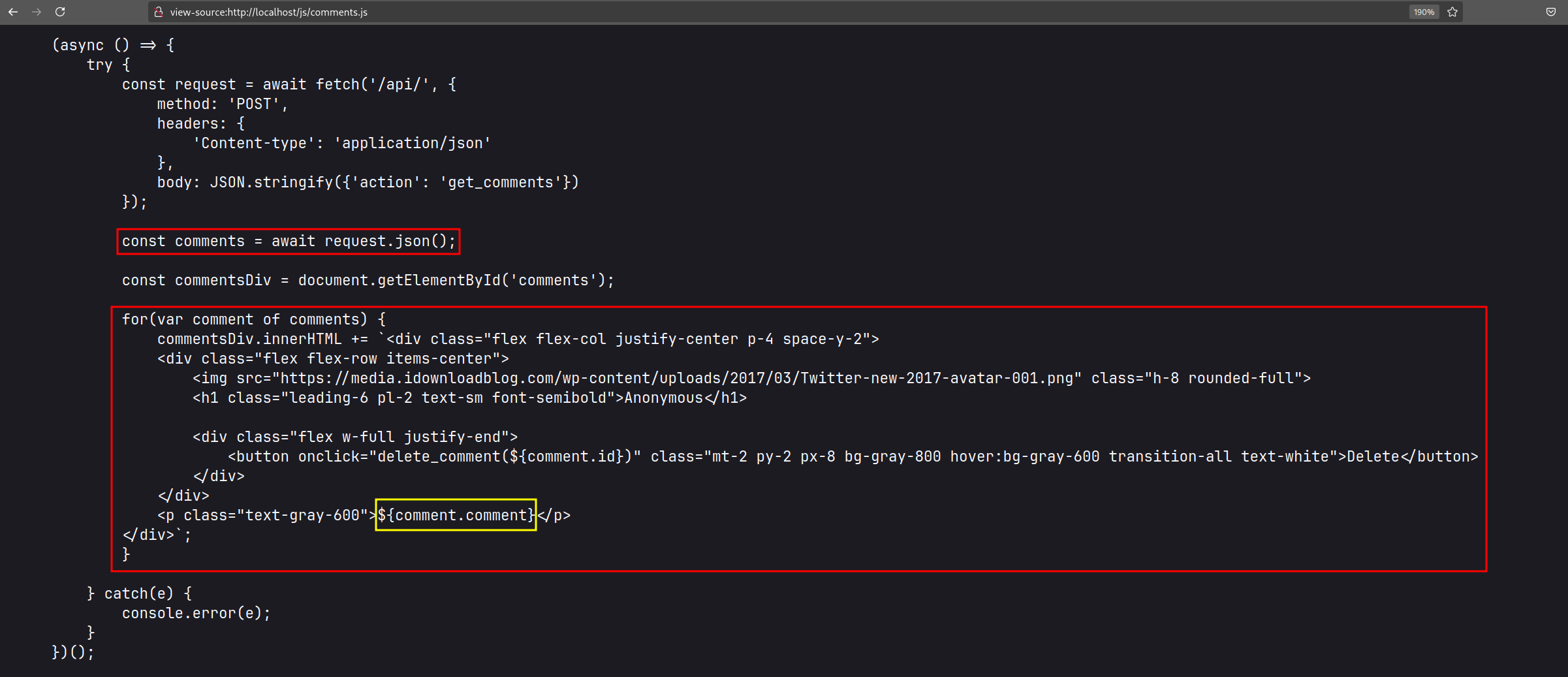 Analisando o código JavaScript da página, vemos que o mesmo utiliza a função "innerHTML" para inserir os comentários na página, e além disso, não faz nenhuma sanitização nos dados: