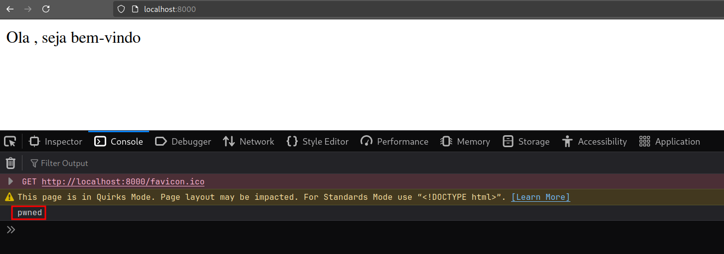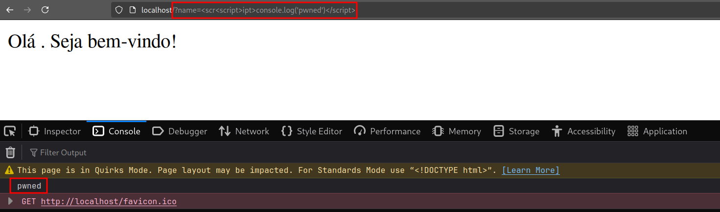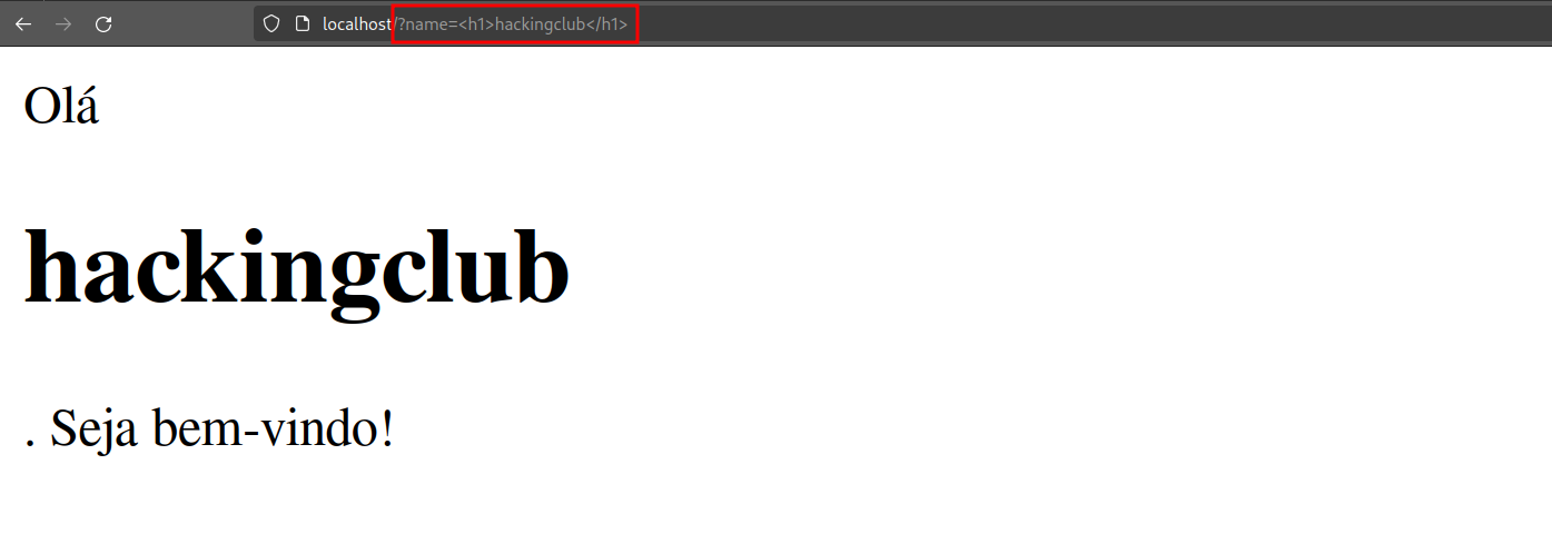 Vemos que a aplicação recebe o parâmetro "name" na URL, e o reflete na página HTML sem fazer nenhuma sanitização. Isso possibilita com que um atacante injete novas tags e scripts na página através do parâmetro.