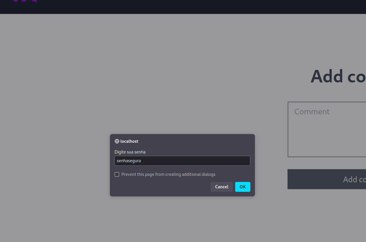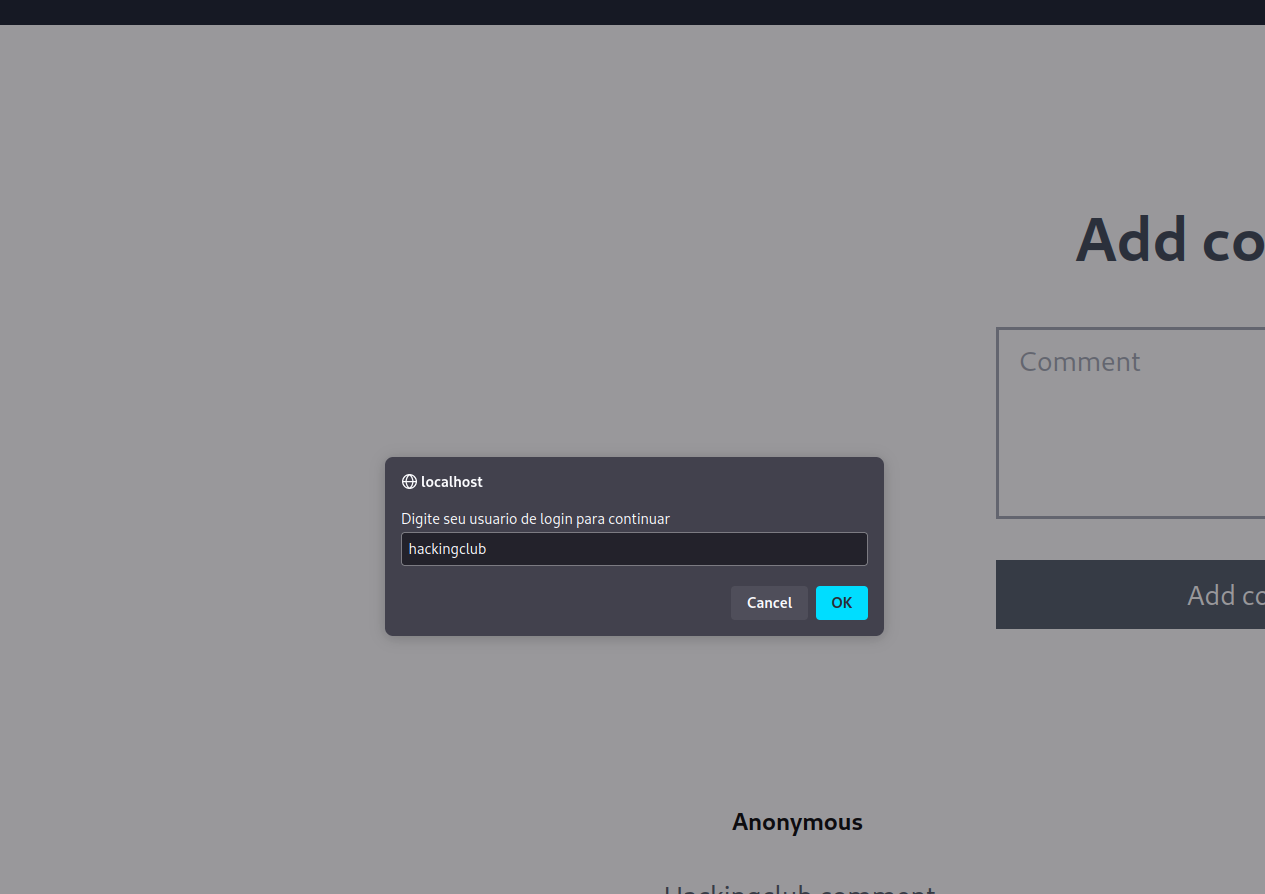 Enviando um comentário com a payload abaixo, conseguimos executar código JavaScript na página: