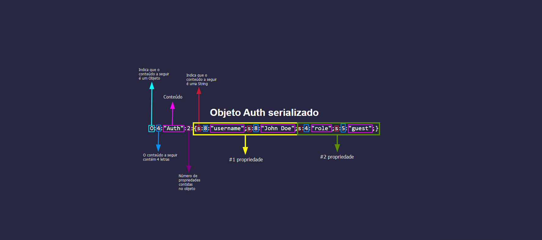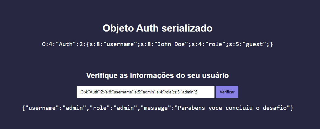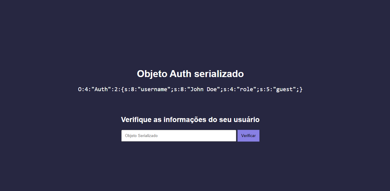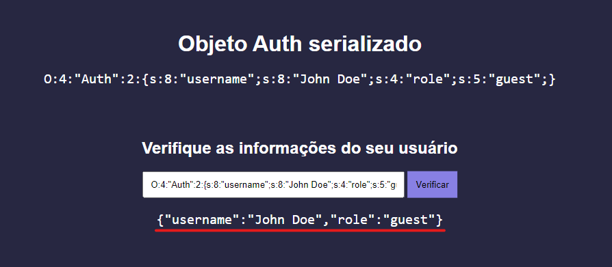 Objeto fornecido: O:4:"Auth":2:{s:8:"username";s:8:"John Doe";s:4:"role";s:5:"guest";}