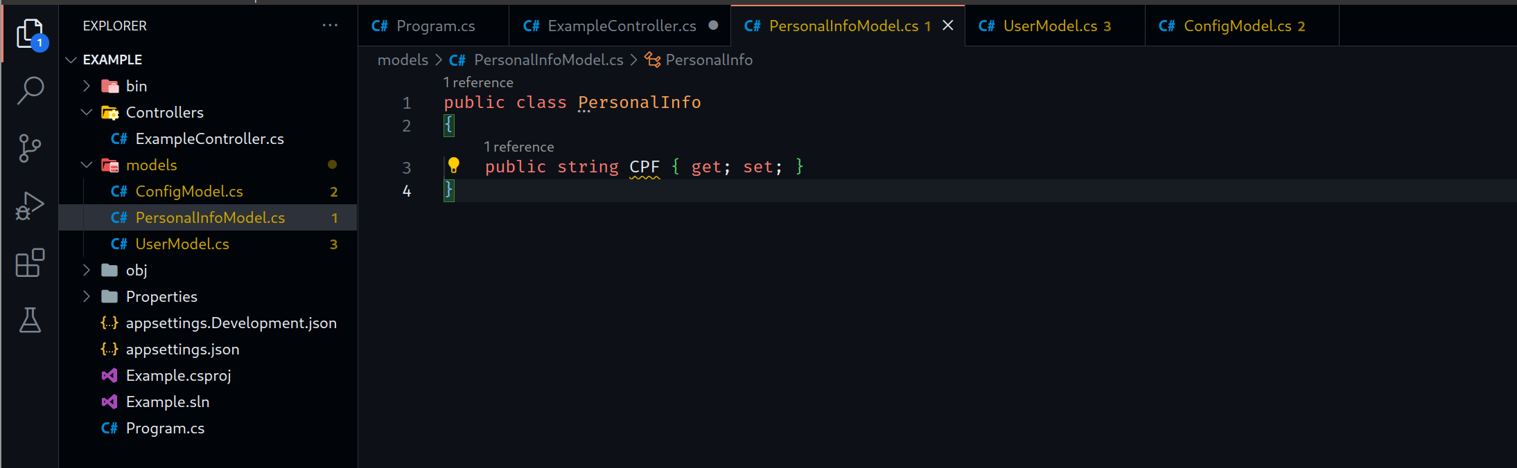 Ao examinar a Controller "ExampleController", vemos que a rota "/api/example" no método GET retorna um objeto do tipo "UserModel", e no método POST é esperado um Json com o objectType "UserModel":