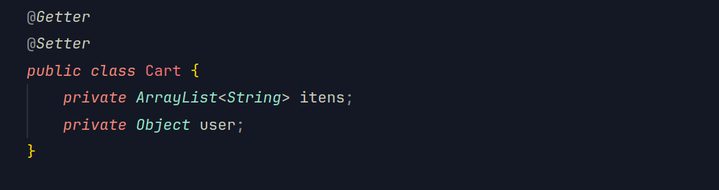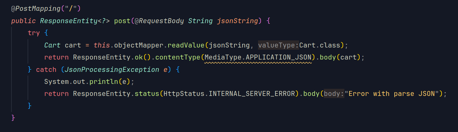Na linha onde ocorre a desserialização, o objeto "Cart" foi especificado como tipagem para o JSON, ou seja, precisamos enviar um JSON correspondente ao objeto "Cart".