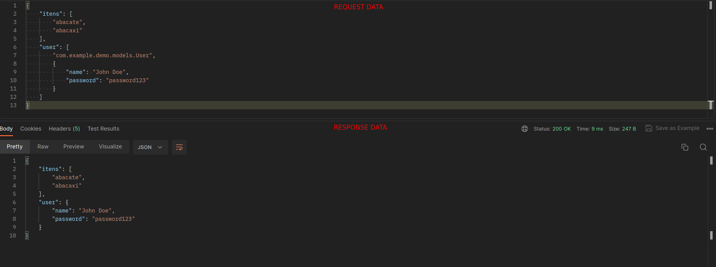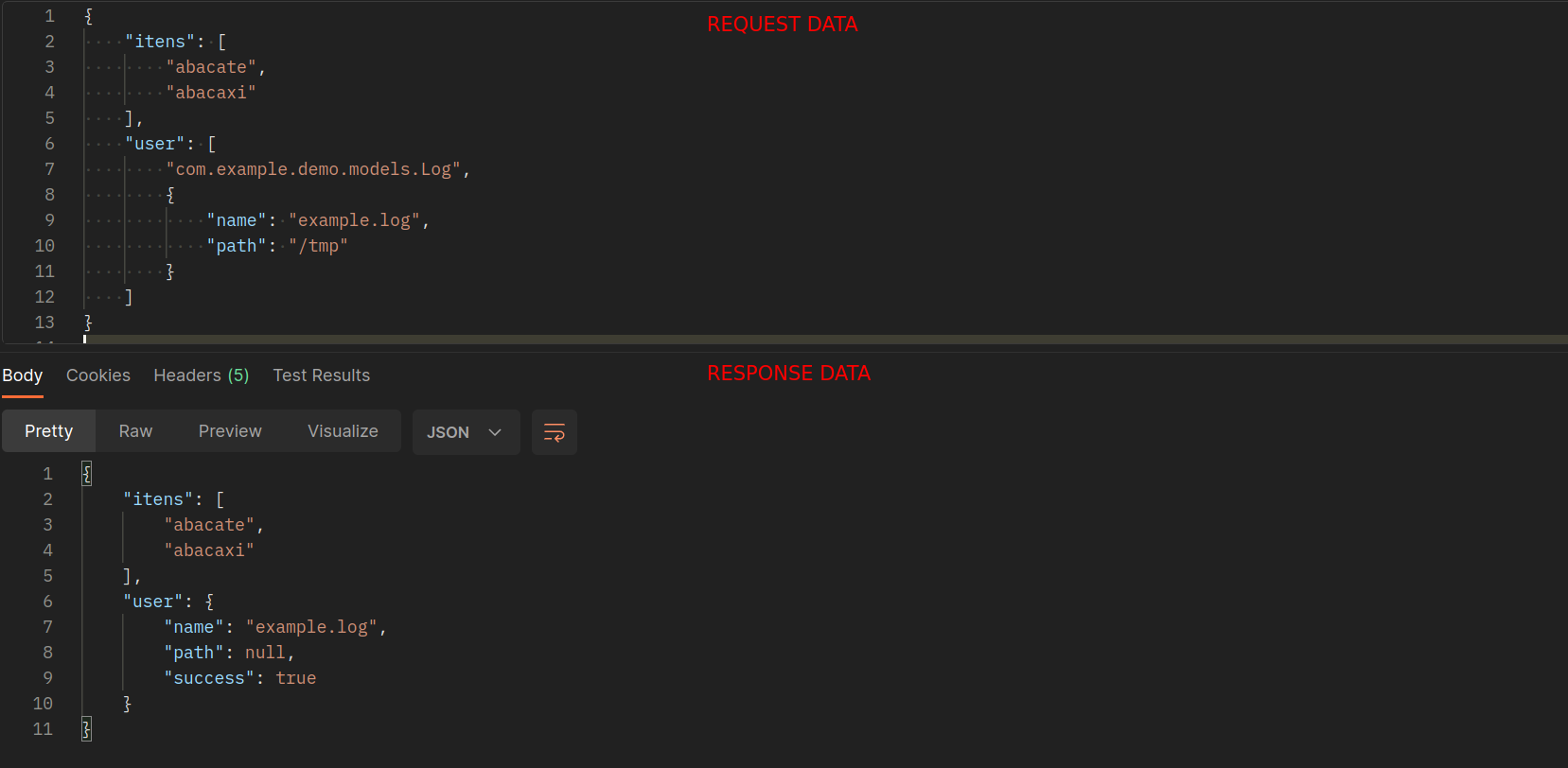 Na propriedade "user", foi necessário especificar o path da classe "User", pois como visto anteriormente, a propriedade foi tipada como "Object", assim o código não consegue identificar qual objeto foi especificado na mesma, sendo assim, necessário especificar o path do objeto dentro do JSON (Isso só é possível pelo fato de que o enableDefaultTyping() foi utilizado).