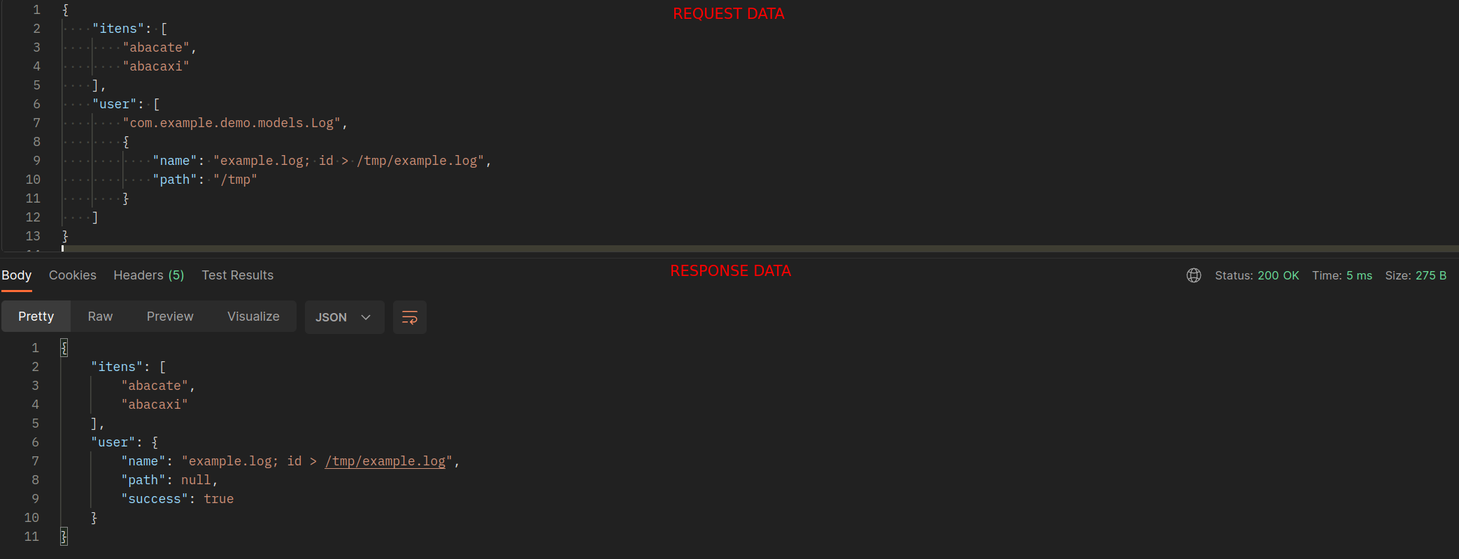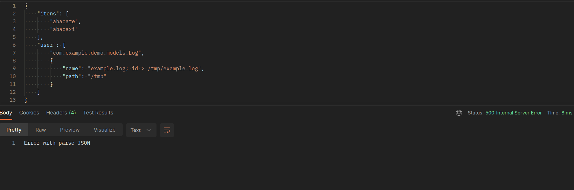 Porém, como dito anteriormente, podemos obter um RCE explorando um command injection através da desserialização. Para isso, podemos utilizar o ";" na propriedade "path" ou na propriedade "name":