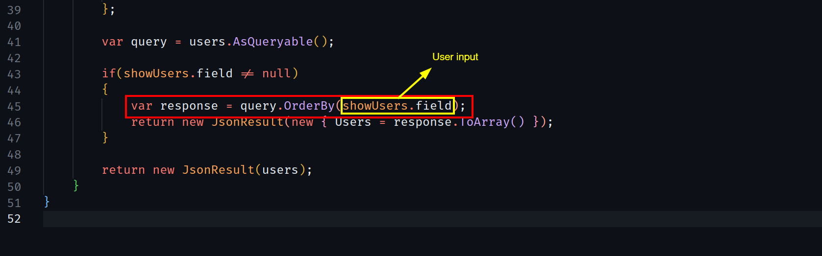 Observe que o código abaixo concatena o input do usuário diretamente na query Linq: