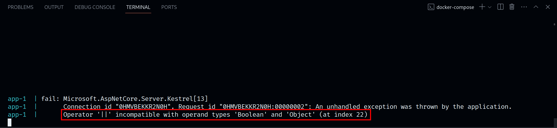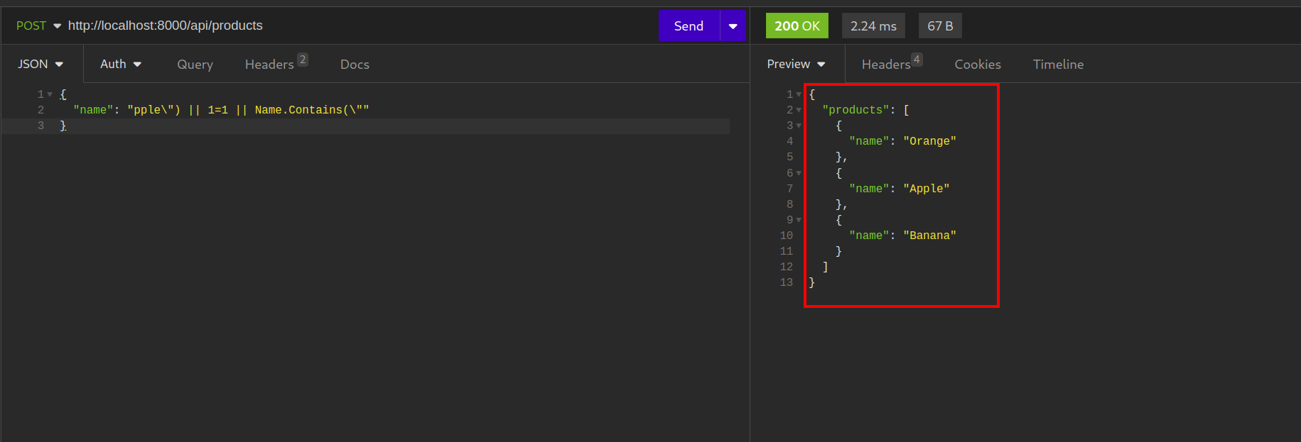 }Veja que no final da payload foi necessário colocar ".ToString()" e fazer uma comparação, pois estamos utilizando o operador "||" para fazer a injeção na query Linq, e isso requer um resultado booleano.