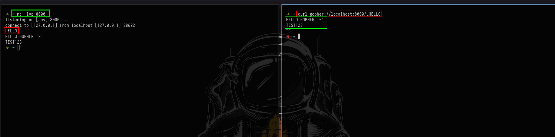 Como vamos acessar serviços internos que comunicam via socket através do SSRF? Para isso podemos utilizar o protocolo Gopher, que se comunica com raw sockets. Se abrirmos um socket na porta 8000 e fazermos uma requisição utilizando o protocolo gopher, conseguiremos interagir com o socket. Veja no exemplo abaixo: