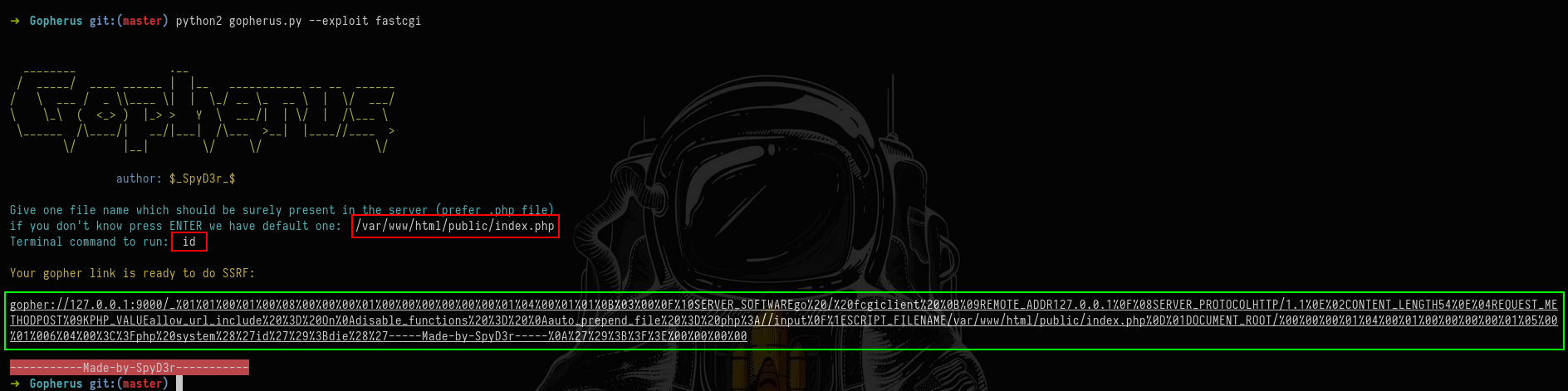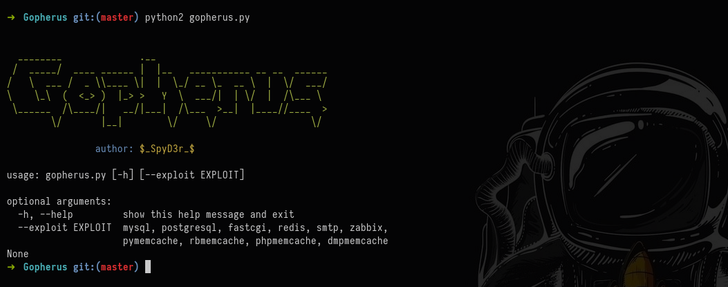 O Gopherus é uma ferramenta que gera payloads para explorarmos serviços internos como mysql, redis, fastcgi (php-fpm), zabbix, memcached utilizando o protocolo gopher. Para obter essa ferramenta, faça o clone do repositório.