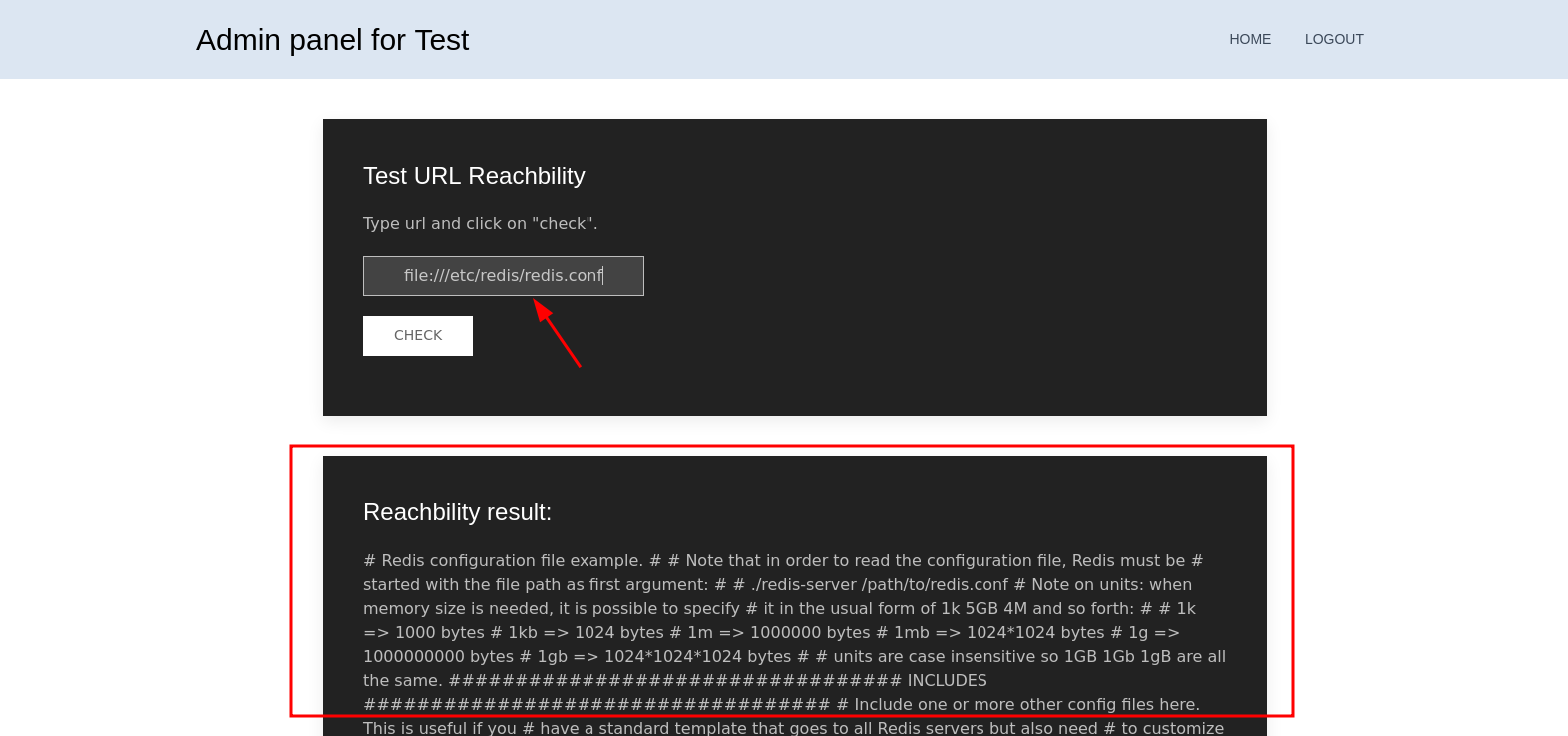 Veja na imagem acima que conseguimos ler o arquivo: "/etc/hosts". Com o poder de ler arquivos do servidor, podemos ler arquivos que contém credenciais de autenticação ou arquivos de configuração. Nessa máquina conseguimos ler o arquivo de configuração do redis e obter a credencial para nos autenticar: