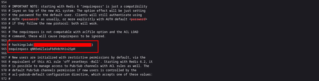 Filtrando por "requirepass" no arquivo, encontramos a senha para autenticar no redis: